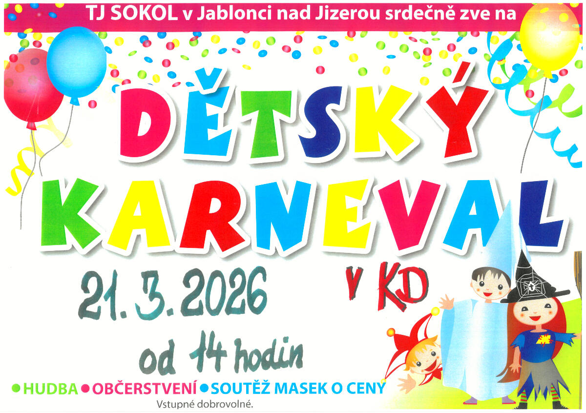 DĚTSKÝ KARNEVAL8.3.2025 od 14:00Kulturní dům Jablonec nad JizerouHudba * Občerstvení * Soutěž masek o ceny